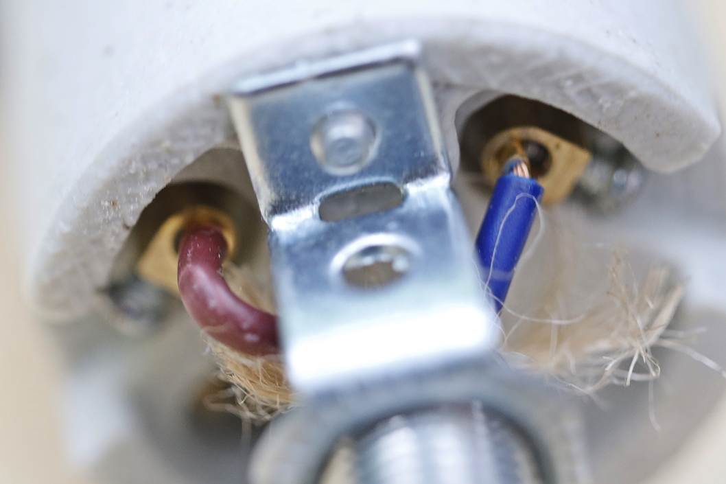 Die Kontakte an der Lampenfassung: braun = Phase, blau = Nullleiter. Eine Markierung hilft, sie so wieder anzuschließen, wie’s sein soll.