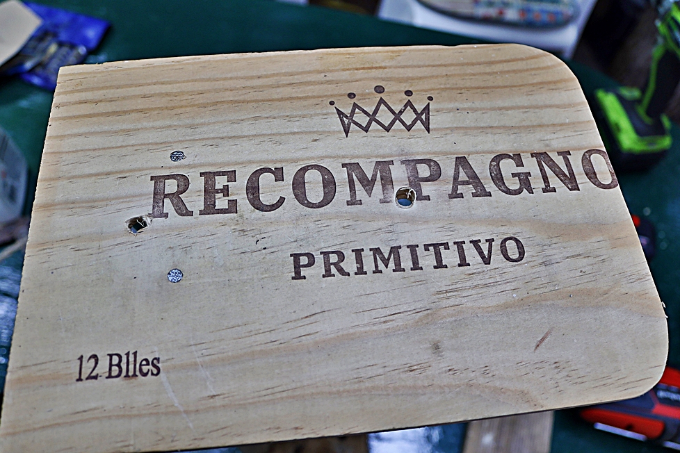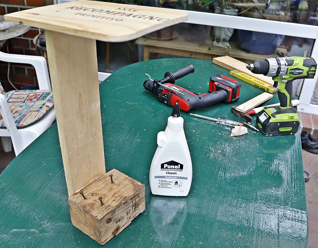 Natürlich können insbesondere die beiden Brettchen ebenso gut aus anderen Holzresten stammen, beispielsweise wird hier eine Variante mit einem Brettchen aus einer Weinkiste gezeigt. Auch die Abmessungen sind im Rahmen des statisch Vernünftigen recht variabel.