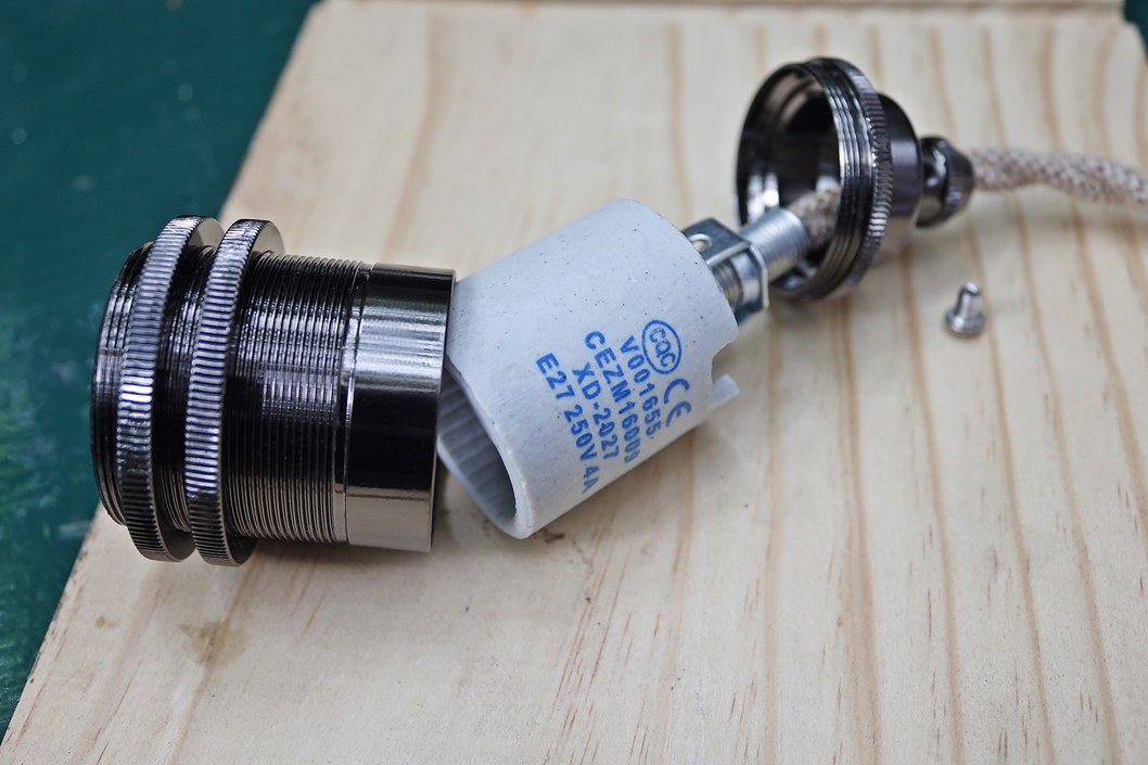 Lampenfassung demontiert, um das Kabel zu lösen, damit es durch die Bohrungen der Lampenrückseite und des Lampendachs gefädelt werden kann. Die beiden Schraubringe vorn auf der Fassung bieten die Möglichkeit, ein Lampenschirmchen anzubringen.
