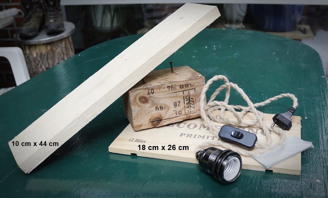 Das Material: Anders als beim Aufmacherfoto wird hier fürs Lampendach das Seitenteil einer Weinkiste verwendet statt ein gleichbreites zweites Brett einer Palette. Der Distanzklotz der Palette bildet später den Lampensockel, typische Abmessung = 140 mm x 97 mm x 76 mm. Die Lampenfassung ist hier mit einem in Jutestrick gefassten Kabel ausgestattet. Weil sich rein zufällig ein 10 cm breites Spiegelchen (aus einem Bartpflege-Set) fand, wurde es als Reflektor mitverarbeitet.