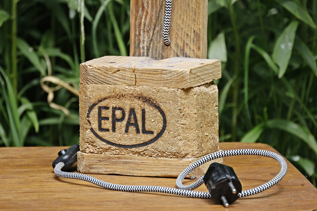 Das Distanzstück dieser Ex-Europalette ist aus Pressspan, hier wurden die anliegenden Bretter einfach abgesägt und stehen gelassen. Das Kabel trägt einen schicken Textilmantel.