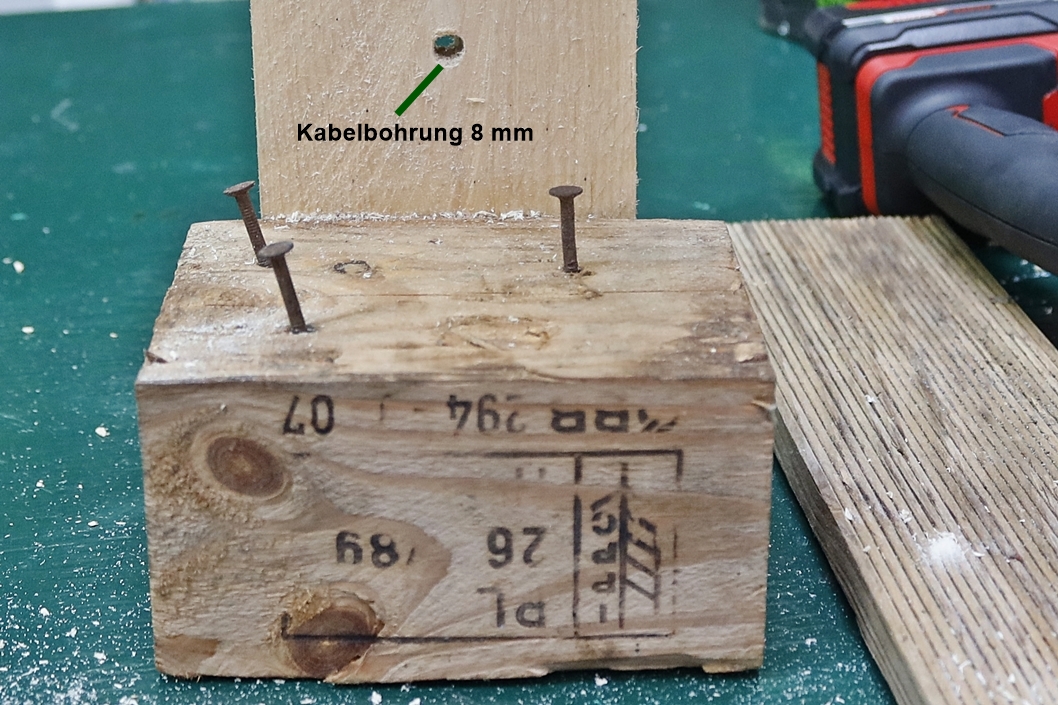 Hier ist das Kabel von der Fassung gelöst, es kann nun problemlos durch die 8-mm-Bohrungen der Holzteile geführt werden.