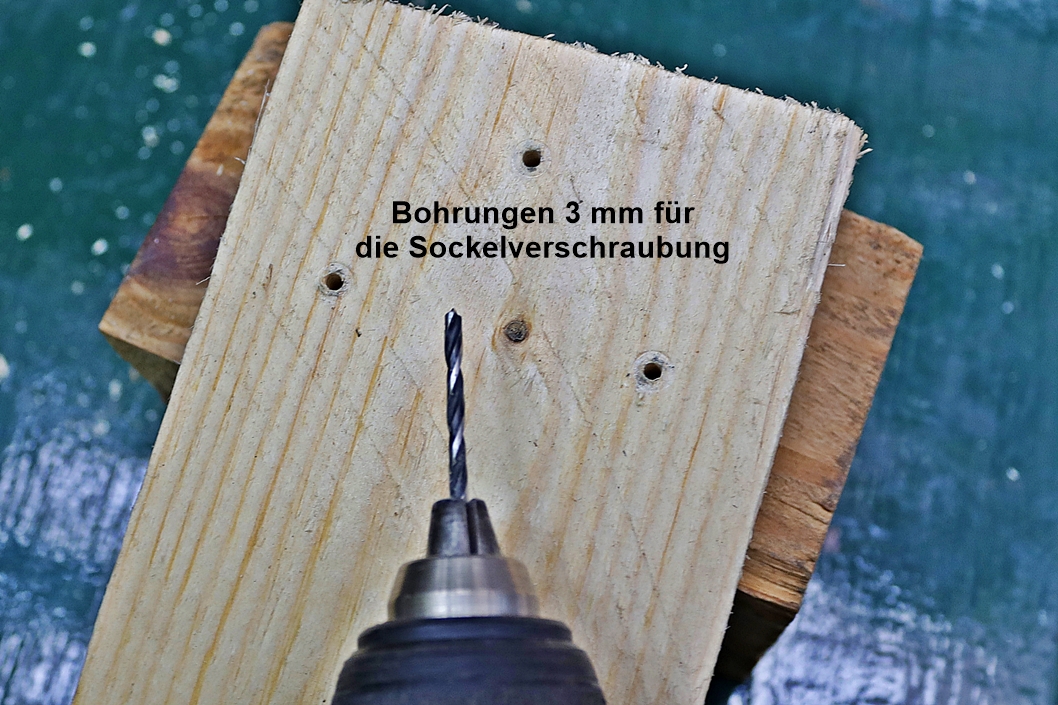 Hier sind die drei Holzteile zum Rohbau zusammengefügt. Die drei korrodierten Originalnägel im Sockel werden bei dieser rustikalen Optik absichtlich stehen gelassen. Abflexen ginge fix. Es fehlen noch die vier 8-mm-Bohrungen für die Kabelführung.